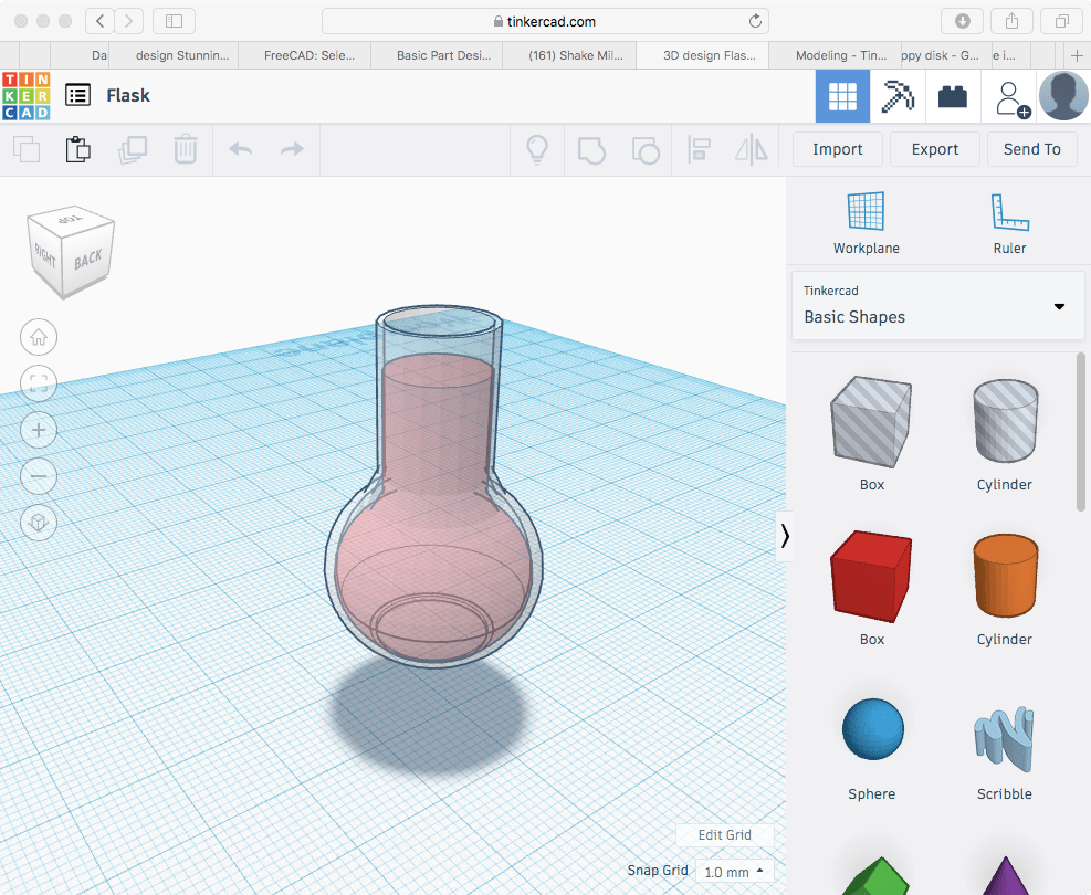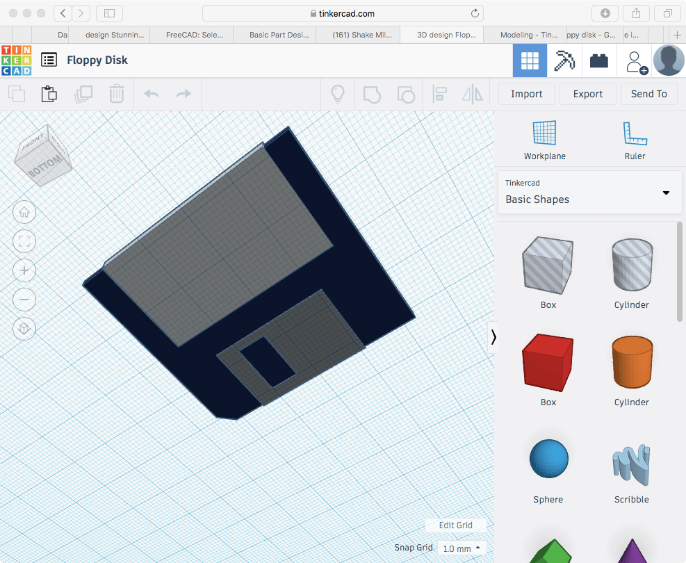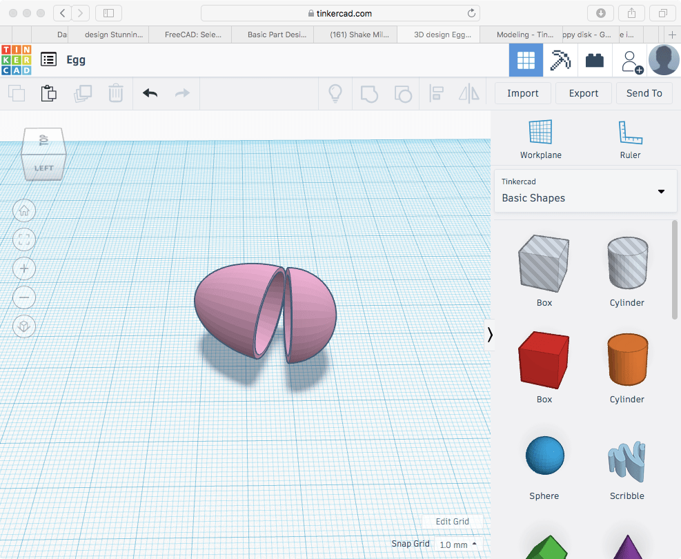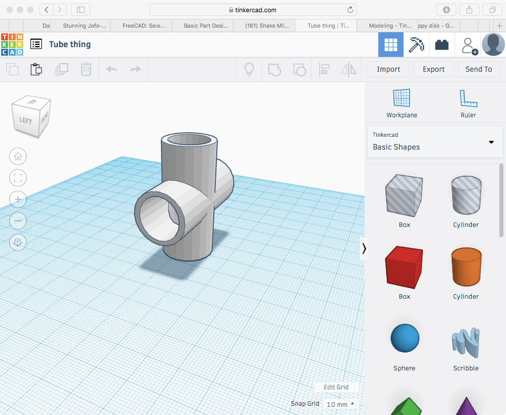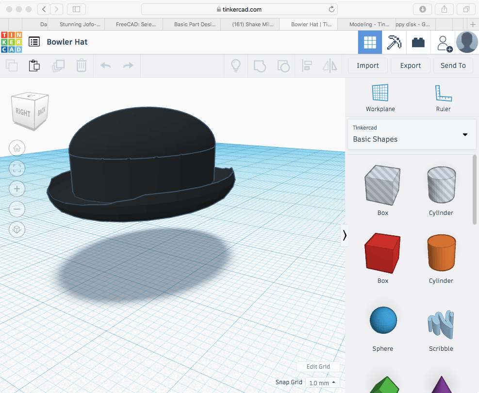 Where to start with this program… I guess I could say I found it pretty easy at first. Making the PVC pipe and the egg was an absolute breeze, each object only taking up a handful of shapes. Then we started progressed into some more difficult tasks, like making a bowler hat with a curved brim or the spoon with the little curve in the neck. Rounding out the shapes were next to impossible for a program that’s supposed to be used by little kids but my world really didn’t end until I got to the glasses. Despite multiple attempts, I had no idea how to shape out the lens and fit it into the frame, in fact, the frame was never actualized, instead I just got stuck rounding out the corners of the lens to no avail as there would constantly either be little jagged edges sticking out or the improper grouping of objects that would make everything come out weird. My idea was to use a wide rounded roof that was stretched out to naturally create the curve in the frame and then put more stretched out, rounded roofs along the side to build the frame but again, I wan’t able to completely carve all the sharp edges so my picture is simply gonna be what the lens WOULD’VE looked like had it been finished. Overall, I’d say the difficult presented in this program was expected as we knew it provided somewhat of a tutorial for basic 3D modeling, however had serious limitations when it came to designing objects with rounded or contorted edges. For a struggle bus though, I don’t think I did too bad even though TinkerCAD is supposed to be for little kids but you know… whatever.